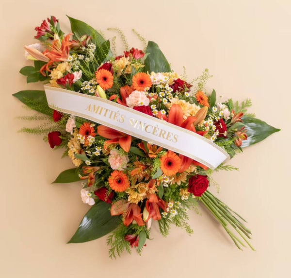 Nos gerbes piquées sont composées de fleurs fraîches , assemblées avec soin pour rendre un hommage élégant et sincère .